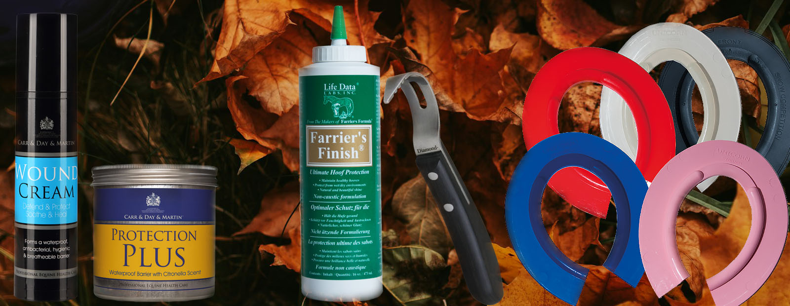 Sårvårdsprodukter för hoven från Carr & Day & Martin • Farriers Finish flytande hovförband från Life Data Labs • Diamond hovkrats • Säsongens snösulor i olika färger