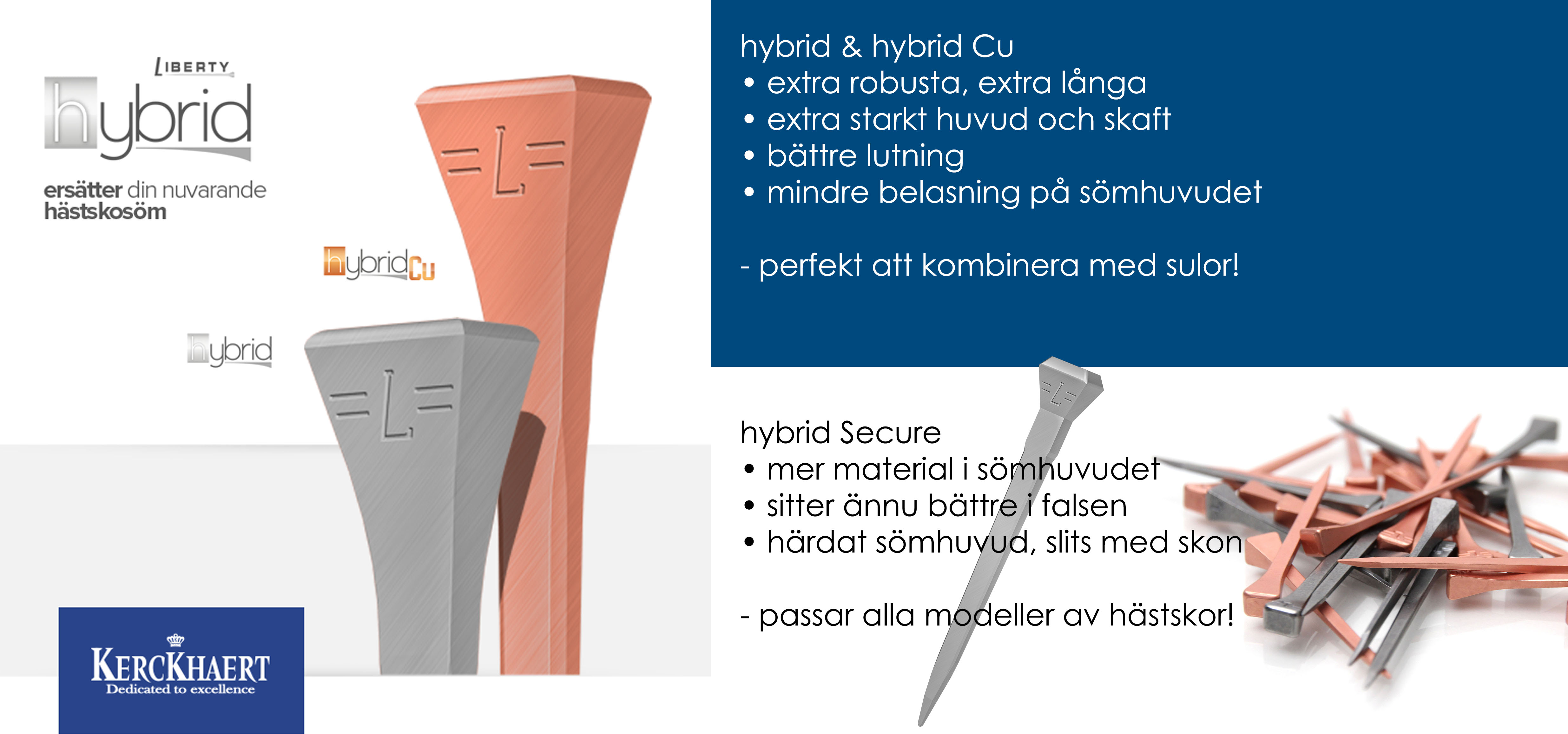 Liberty Hybrid finns även beklädd med ett tunt lager koppar - Liberty Cu - som ger ett antimikrobiellt motstånd under hela skoningsperioden. Det reducerar mängden bakterier som normalt kommer in i hoven via sömhålen och motverkar därmed infektioner. Liberty Hybrid Cu orsakar ingen rost eller nötning inuti hovväggen och förbättrar hoven och hornets kvalité. Hoven blir helt enkelt starkare och friskare!