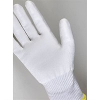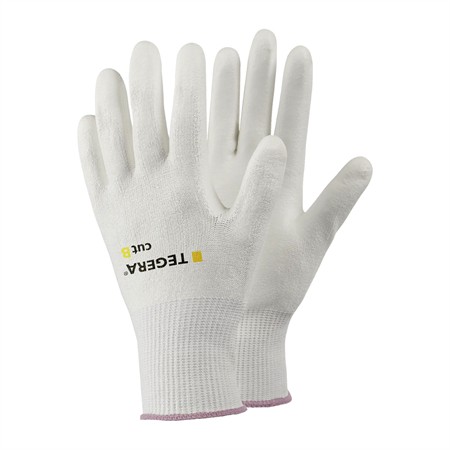 En vit skärskyddshandske (skärskyddsnivå B) som gör det enklare att upptäcka smuts.
